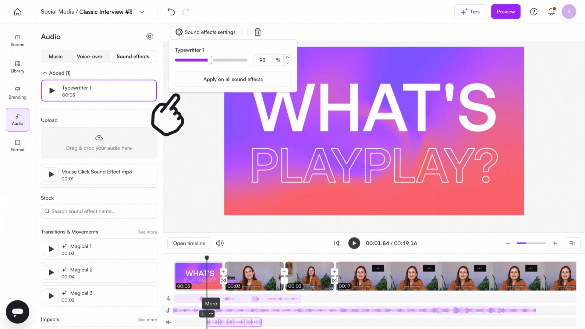 Mit PlayPlay können Sie ganz einfach Soundeffekte zu Ihren Videos hinzufügen und sie so dynamischer und ansprechender gestalten.